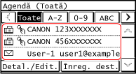 Când specificați destinații prin apelarea agendei din ecranul [Pornire] sau de pe ecranul de scanare sau ecranul de fax, utilizați lista de destinație.