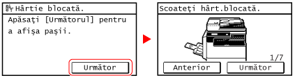 Când toate blocajele de hârtie au fost eliminateScoateți imediat mâinile din aparat și din echipamentul opțional, astfel încât îmbrăcămintea și hainele să nu fie prinse în role.