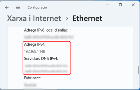 A [Propietats], consulteu l'adreça IP i el servidor DNS.