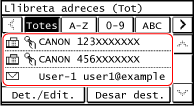 Quan especifiqueu les destinacions escollint a la llibreta d'adreces des de la pantalla [Inici] o la pantalla de lectura o fax utilitzeu la llista de destinacions.