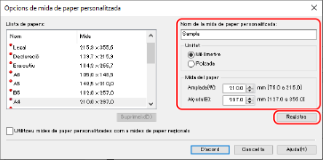 Introduïu el nom del paper de mida personalitzada i la mida del paper i feu clic a [Registra].