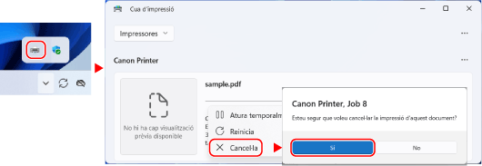Si no es mostra la pantalla anterior, feu doble clic a la icona de la impressora a l'àrea de notificació de Windows, seleccioneu el document que voleu cancel·lar i feu clic a [Document]