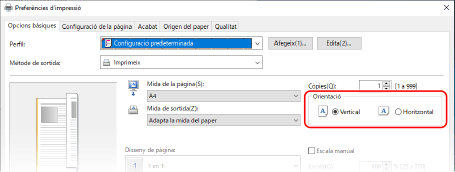 [Ordre de pàgines] [Una cara/Doble cara/Impressió de quaderns] [Ubicació d'enquadernació].