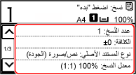 بالإضافة إلى إعدادات النسخ الأساسية، يحتوي الجهاز أيضًا على إعدادات لضبط جودة الصورة، وإعدادات أخرى وفقًا للمستند الأصلي والغرض. استخدم شاشة النسخ لتكوين هذه الإعدادات.