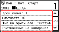 В допълнение към основните настройки за копиране, устройството има и настройки за регулиране на качеството на изображението и други настройки според оригинала и целта ви. Използвайте екрана за копиране, за да конфигурирате тези настройки.