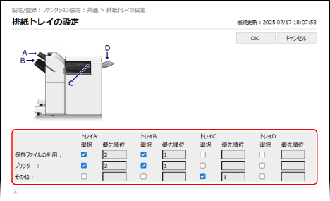 1 つの機能に複数の排紙トレイを指定して、優先順位を指定することもできます。その場合、上位に指定した排紙トレイの容量がいっぱいになると、排紙先は下位に指定したトレイに自動的に切り替わります。
