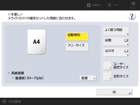 自動検知可能な用紙サイズセットした用紙と異なるサイズが表示されている場合は、用紙が正しくセットされていない可能性がありますので、用紙をセットしなおします。