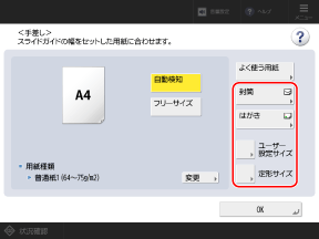 自動検知されないサイズの用紙をセットした場合や、用紙をセットしなおしても異なる用紙サイズが表示される場合は、[定形サイズ]を押して、セットした用紙のサイズを選択します。