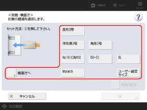 セットした封筒の向きに応じて[縦置きへ]または[横置きへ]を押し、封筒のサイズを選択します。
