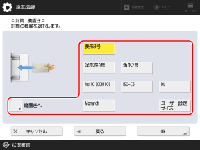 封筒の向きに応じて[縦置きへ]または[横置きへ]を押し、封筒のサイズを選択します。