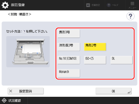 封筒のサイズによっては、[次へ]が表示されます。[次へ]を押して、セットした封筒のフラップ長を入力し、[OK]を押します。