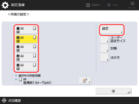 初期設定では、用紙種類は普通紙1に設定されています。種類が異なる用紙をセットした場合や、操作パネルに表示されているサイズがセットした用紙と異なる場合は、用紙設定を変更します。