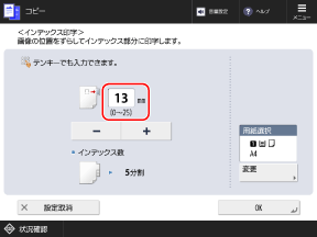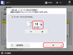 同じページにインデックス紙を 2 枚以上挿入する場合は、ボタンを押し、選択した状態にしてから、挿入枚数をテンキーで入力します。