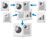 用紙を重ね合わせて中央で 2 つに折ると小冊子になるように、ページを割り付けて両面プリントします。本文とは異なる用紙を使用して、表紙を付けることもできます。