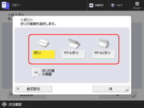手順1で[サドル折り]を押した場合は、[折り位置の調整]を押すと、用紙を折る位置を用紙サイズごとに調整できます。