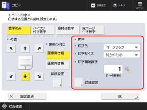 [詳細設定]を押すと、ページ番号と併せて任意の文字列も付けるように設定したり、印字するページ範囲を指定したりできます。