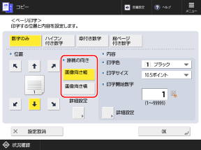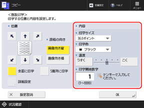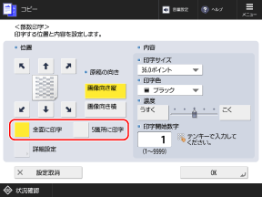※部数番号と併せて他の情報も付けるように設定されている場合は、[全面に印字]と[5箇所に印字]は選択できません。