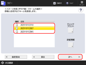 フォーム画像を選択し、[チェックプリント]を押すと、フォーム画像のみをプリントして内容を確認できます。