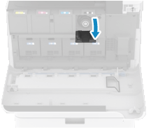 トナーカートリッジの平らな面を下にし、スライドさせながら奥までしっかりと押し込みます。トナーカートリッジが奥まで押し込まれていないと、小カバーは閉まりません。無理に閉めようとすると、破損するおそれがあります。
