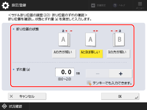 数値を直接入力して調整する方法と、テストページをプリントし、そのテストページで折り位置のずれ幅を確認して調整する方法があります。
