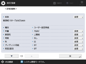 [用紙種類の管理設定]を押し、用紙種類を選択して[詳細/編集]を押すと、[詳細/編集]画面が表示されます。