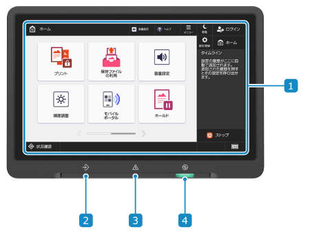 各機能を操作する画面や使用状況、メッセージなどが表示されます。タッチパネルになっているため、画面に指で直接触れて操作します。