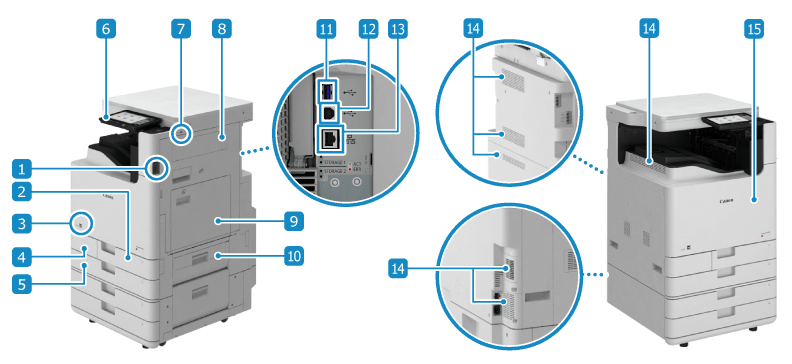 オプション装着時の本機の構成と、オプション機器の各部の名称については、以下を参照してください。