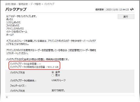 [バックアップデータの全体容量]に対して[バックアップデータの格納先の空き容量]が十分でない場合は、バックアップデータの保存先を設定しなおします。