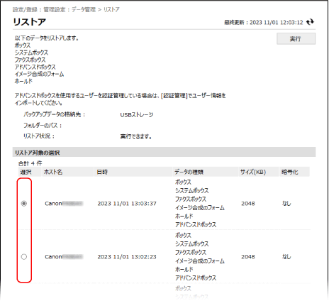 アドバンスドボックスの個人スペースのデータが含まれる場合、バックアップ元と同じユーザー情報が登録されていないと、個人スペースのデータは復元されません。その場合は、バックアップ元でユーザー情報をエクスポートし、本機にインポートしてから復元を実行します。