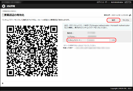 ユーザー名「Administrator」でログインする場合は、パスワードを初期設定の「7654321」から変更します。[認証ユーザーの登録/編集]