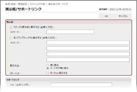 お知らせをリモートUIのポータル画面の[掲示板]にも表示する場合は、[リモートUI]の[ポータルに表示する]にチェックマークを付けます。