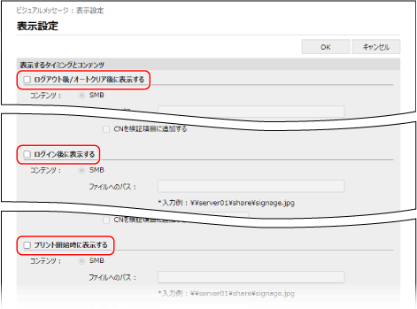 各タイミングの[コンテンツ]で、表示するコンテンツにアクセスするときのプロトコル([SMB]または[HTTP/WebDAV])を選択し、コンテンツへのパスを入力します。