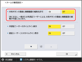 管理者ユーザー以外による共有ボタンの追加と[機器画面]の変更を許可する場合は、[ON]に設定します。
