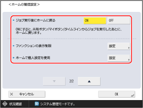 各ユーザーが[ホーム]画面でカスタマイズできる項目を制限する場合は、[設定]を押し、制限する項目を[OFF]に設定して、[OK]を押します。