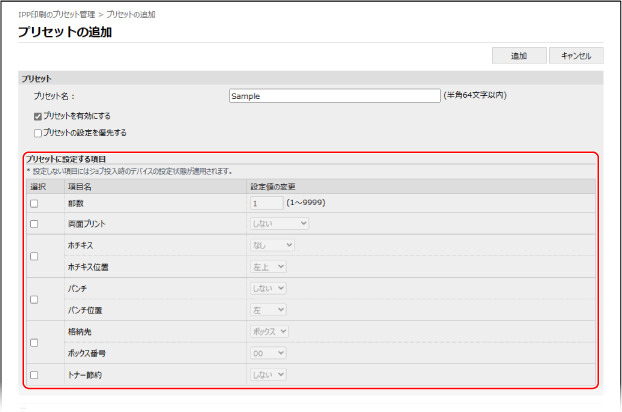 [IPP印刷のプリセット管理]画面で、編集したいプリセット名をクリックすると、設定内容を編集できます。
