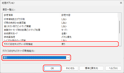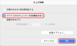 [デバイスのセキュリティ印刷機能を使う]にチェックマークを付け、[OK]をクリックする