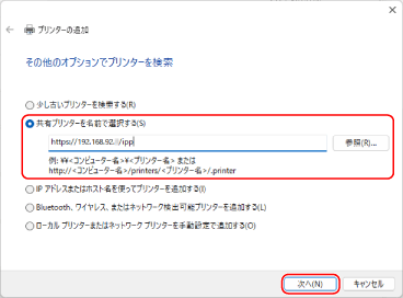 [共有プリンターを名前で選択する]を選択し、接続先を入力して、[次へ]をクリックする