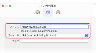 IPPプリントを使用する場合は、パソコンに本機を登録するときの[プロトコル]と[アドレス]を、以下のとおり設定します。