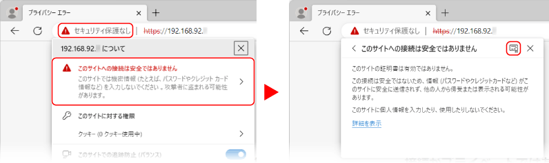 URL入力欄の[セキュリティ保護なし][このサイトへの接続は安全ではありません]](証明書の表示)をクリックする