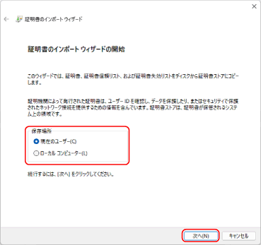 [証明書のインポートウィザード]画面が表示されます。