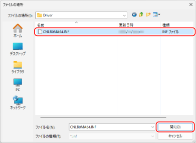 プリンタードライバーのフォルダーを開き、[Driver]フォルダー内のINFファイルを選択して、[開く]をクリックする