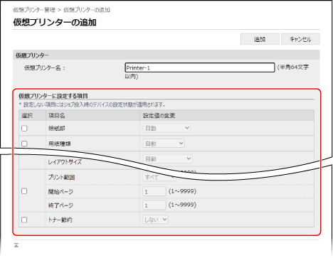 [仮想プリンターに設定する項目]で、プリント設定をする
