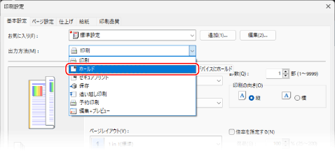 ドライバーのプリント設定でホールド機能を設定し、ホールド文書として本機に送信します。