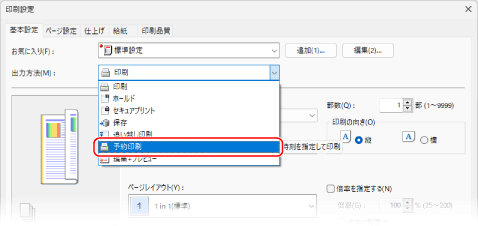 [出力方法]で[予約印刷]を選択する