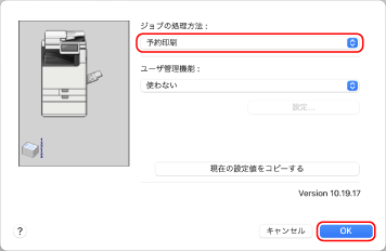 [ジョブの処理方法]で[予約印刷]を選択し、[OK]をクリックする