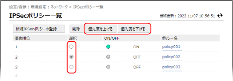 ポリシーを選択し、[優先度を上げる]/[優先度を下げる]をクリックして優先順位を設定します。上位のポリシーが優先してIPSec通信に適用されます。