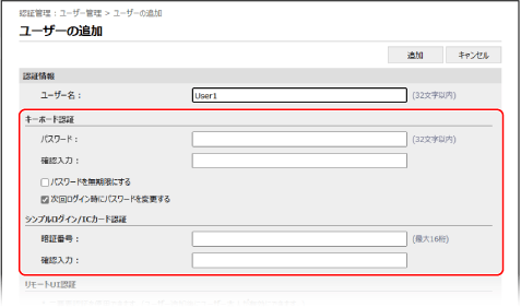 [キーボード認証]で、ログイン時に入力するパスワードを設定します。[パスワード]と[確認入力]の両方に同じパスワードを入力します。