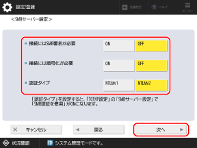 暗号化や認証の設定をし、[次へ]を押します。