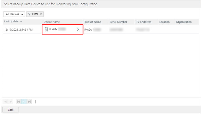 On the [Select Backup Data Device to Use for Monitoring Item Configuration] page, select the backup data to use for monitoring, and click [Select].