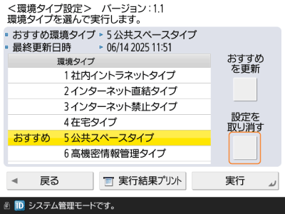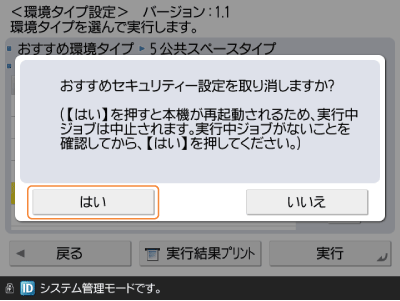 本機を各タイプでおすすめのセキュリティー設定に変更したあと、必要な機能が利用できなくなった場合などは、変更を取り消して元に戻すことができます。
